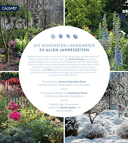 Landgärten gibt dieses Buch zahlreiche Anregungen, wie diese Glanzpunkte im Laufe einer Gartensaison aussehen können. Vorgestellt werden unterschiedliche Gartenstile von natürlich über verspielt und romantisch bis hin zu eleganten Gärten. Für ein möglichst vielfältiges Bild wird jede Jahreszeit zu mehreren Terminen gezeigt. Richtschnur hierfür ist der sogenannte phänologische Kalender, der das Jahr in zehn Phasen teilt und sich an charakteristischen Entwicklungsstadien typischer Pflanzen orientiert. Jeder dieser Phasen ist ein beispielhaftes Gartenporträt gewidmet. Darüber hinaus laden vier komplett und opulent durch das gesamte Jahr fotografierte Gärten zum Schwelgen und Träumen ein. So ergibt sich ein umfassender Eindruck wie Gärten zu unterschiedlichen Zeiten wirken können, welche Pflanzen wann ihren großen Auftritt haben und wie sie auch in ihrer Ruhezeit den Betrachter verzaubern – die Schönheit ländlicher Gärten im Jahresverlauf!